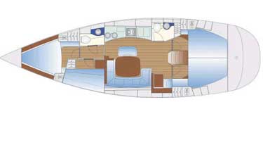 A well equipped navigation station with GPS, independent plotter and full instrumentation is accompanied by an autopilot connected to the twin wheel steering and shorepower. On deck she has an electric anchor windlass, furling genoa and stacpac mainsail with adjustable backstay and all lines led aft to cockpit plus tender and outboard. She has a 55hp sail-drive, and offers charterers the chance to sail a large, modern boat in considerable comfort